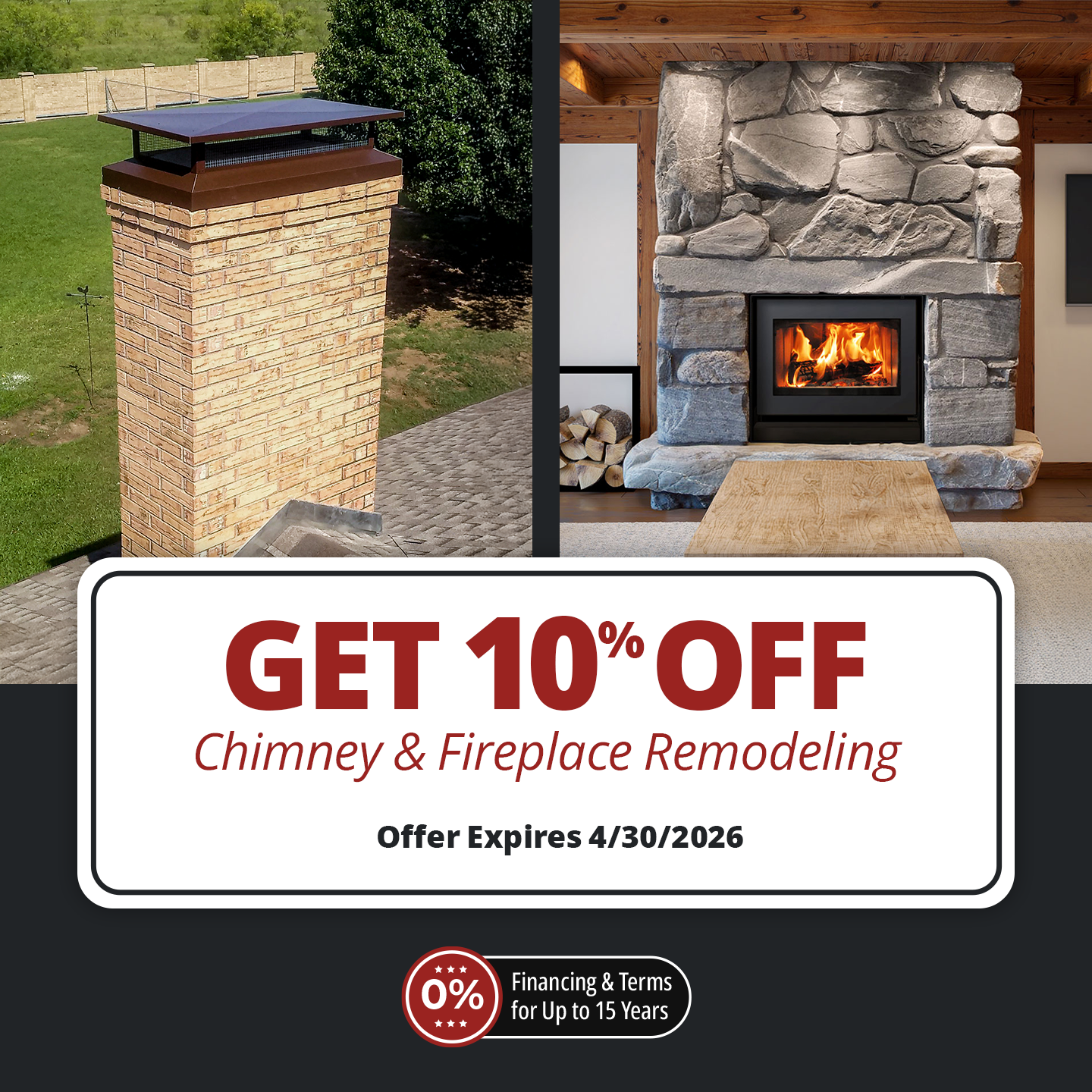 Fill out the form below to get 10% off chimney & fireplace remodeling. Expires 4/30/2026.